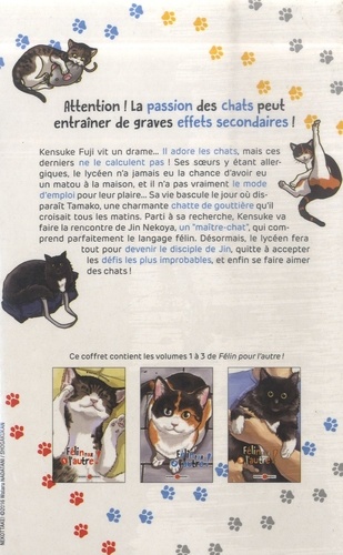 Kensuke Fuji vit un drame... Il adore les chats, mais ces derniers ne le calculent pas ! Ses soeurs y étant allergiques, le lycéen n'a jamais eu la chance d'avoir eu un matou à la maison, et il n'a pas vraiment le mode d'emploi pour leur plaire... Sa vie bascule le jour où disparaît Tamako, une charmante chatte de gouttière qu'il croisait tous les matins. Parti à sa recherche, Kensuke va faire la rencontre de Jin Nekoya, un "maître-chat", qui comprend parfaitement le langage félin. Désormais, le lycéen fera tout pour devenir le disciple de Jin, quitte à accepter les défis les plus improbables, et enfin se faire aimer des chats ! Ce coffret contient les volumes 1 à 3 de Félin pour l'autre !