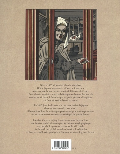Née en 1803 à Plouhinec dans le Morbihan, Hélène Jégado, surnommée " Fleur de Tonnerre ", reste à ce jour la pire tueuse en série de l'Histoire de France. Cette discrète cuisinière traversa la Bretagne en laissant derrière elle nombre de victimes. Il faut dire que ses petits gâteaux à l'angélique et à l'arsenic étaient bons à en mourir. En 2013, Jean Teulé retrace le parcours fatal de la Jégado dans un roman cruel et savoureux. Ii brosse le tableau d'une Bretagne pétrie de religion et de superstitions où les petits travers sont souvent suivis par de grands drames. Jean-Luc Cornette et Jürg donnent au roman de Jean Teulé une lumière tamisée de matin pluvieux dans un style graphique qui rappelle les gravures bretonnes du XIXe siècle. Sur la lande, au pied des menhirs, derrière les chapelles et dans les combles des presbytères, l'humour se teinte de gris et de noir.