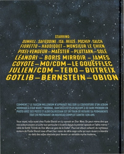 Chez Fluide Glacial, nous aimons Star Wars. On peut même dire que nos auteurs vouent un culte tout particulier à la série depuis le premier épisode et l'édito mémorable de Gotlib "Entrée de Star Wars en gare de la Ciotat". Pour cet album collectif, de nombreux auteurs de Fluide Glacial nous offrent leur vision de cette saga culte qui aura réussi à s'étendre au-delà des salles obscures pour devenir un véritable mythe moderne.