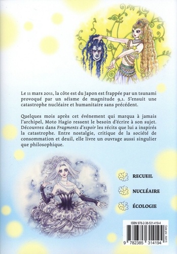 Le 11 mars 2011, la côte est du Japon est frappée par un tsunami provoqué par un séisme de magnitude 9,1. S'ensuit une catastrophe nucléaire et humanitaire sans précédent. Quelques mois après cet événement qui marqua à jamais l'archipel, Moto Hagio ressent le besoin d'écrire à son sujet. Découvrez dans Fragments d'espoir les récits que lui a inspirés la catastrophe. Entre nostalgie, critique de la société de consommation et deuil, elle livre un ouvrage aussi singulier que philosophique.