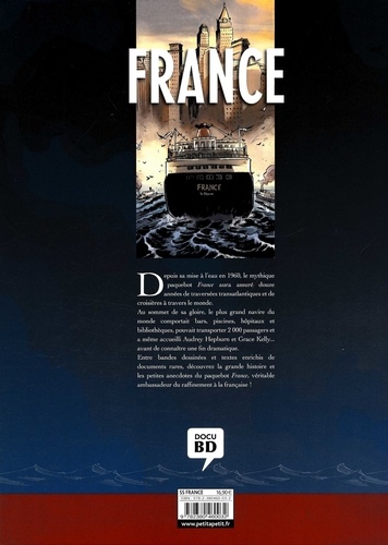 Depuis sa mise à l'eau en 1960, le mythique paquebot France aura assuré douze années de traversées transatlantiques et de croisières à travers le monde. Au sommet de sa gloire, le plus grand navire du monde comportait bars, piscines, hôpitaux et bibliothèques, pouvait transporter 2 000 passagers et a même accueilli Audrey Hepburn et Grace Kelly... avant de connaître une fin dramatique. Entre bandes dessinées et textes enrichis de documents rares, découvrez la grande histoire et les petites anecdotes du paquebot France, véritable ambassadeur du raffinement à la française !