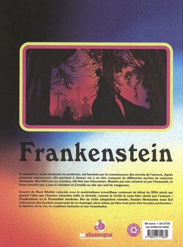 Frankenstein, jeune étudiante en médecine, est fascinée par la connaissance des secrets de l'univers. Après plusieurs expériences, elle parvient à donner vie à un être composé de différentes parties de cadavres disséqués. Horrifiée par sa création, elle fuit son laboratoire. Rejetée par son créateur et par l'humanité, la haine envahit peu à peu la créature et s'éveille en elle une soif de vengeance. L'oeuvre de Mary Shelley coïncide avec le matérialisme scientifique croissant du début du XIXe siècle qui nourrit l'idée que l'homme atteindra enfin la divinité, comme le révèle le sous-titre choisi par l'auteure : Frankenstein ou le Prométhée moderne. Par sa riche adaptation visuelle, Sandra Hernández nous fait redécouvrir des facettes inaperçues de ce classique alors même qu'elles sont peut-être les plus pertinentes : le mystère de la vie, la condition humaine et ses vicissitudes.