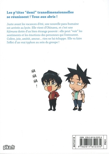 Les p'tites "demi" transdimensionnelles se réunissent ! Tous aux abris ! Juste avant les vacances d'été, une nouvelle para-humaine est arrivée au lycée. Elle vient d'Okinawa, et c'est une kijimuna dotée d'un bien étrange pouvoir : elle peut "voir" les sentiments et les émotions des personnes qui l'entourent. Colère, joie, amitié, amour... rien ne lui échappe. Elle va faire l'effet d'un vrai typhon au sein du groupe !