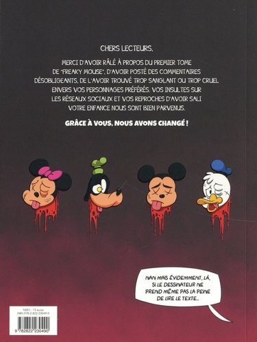 Chers lecteurs. Merci d'avoir râlé à propos du premier tome de "freaky mouse", d'avoir posté des commentaires désobligeants, de l'avoir trouve trop sanglant ou trop cruel envers vos personnages préférés. Vos insultes sur les réseaux sociaux et vos reproches d'avoir sali votre enfance nous sont bien parvenus. Grâce à vous, nous avons changé !