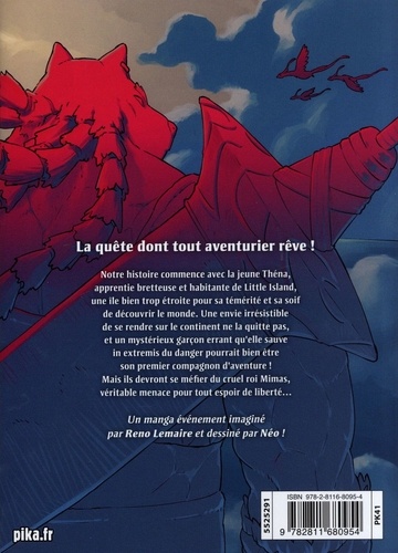 La quête dont tout aventurier rêve ! Notre histoire commence avec la jeune Théna, apprentie bretteuse et habitante de Little Island, une île bien trop étroite pour sa témérité et sa soif de découvrir le monde. Une envie irrésistible de se rendre sur le continent ne la quitte pas, et un mystérieux garçon errant qu'elle sauve in extremis du danger pourrait bien être son premier compagnon d'aventure ! Mais ils devront se méfier du cruel roi Mimas, véritable menace pour tout espoir de liberté... Un manga événement imaginé par Reno Lemaire et dessiné par Néo !