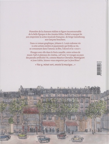 Pionnière de la chanson réaliste et figure incontournable de la Belle Epoque et des Années folles, Fréhel a marqué de son empreinte la scène musicale française, de Serge Gainsbourg aux Garçons bouchers. Dans ce roman graphique, Johann G. Louis redonne vie à cette artiste entière et passionnée qui brûla sa vie, se consumant dans l'amour, la fête, l'alcool et la " coco ". Plongez avec elle dans le Paris canaille, entre scènes de music-hall et plateaux de cinéma, caf'conc' et voyages au pays des paradis artificiels ! Et, comme Maurice Chevalier, Mistinguett et Jean Gabin, laissez-vous emporter par La Java bleue ! " Vas-y, minet vert, envoie la musique... "