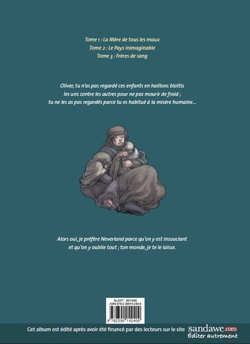 Le triptyque "Oliver & Peter" est une fuite éperdue, entre un Londres victorien peuple de voleurs et de prostituées, et un lieu à la cartographie incertaine où l'on oublie tout, une île où les habitants sont sommés de ne pas grandir sous peine de mort : Neverland. C'est la traque d'un enfant par un monstre, Crochet, qui veut achever ce qu'il n'a pas réussi plusieurs années auparavant : tuer ce frère indésirable, Peter, responsable de la mort de leur mère.