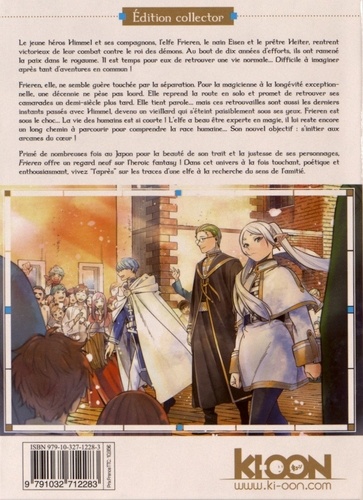 Le jeune héros Himmel et ses compagnons, l'elfe Frieren, le nain Eisen et le prêtre Heiter, rentrent victorieux de leur combat contre le roi des démons. Au bout de dix années d'efforts, ils ont ramené la paix dans le royaume. Il est temps pour eux de retrouver une vie normale... Difficile à imaginer après tant d'aventures en commun ! Frieren, elle, ne semble guère touchée par la séparation. Pour la magicienne à la longévité exceptionnelle, une décennie ne pèse pas lourd. Elle reprend la route en solo et promet de retrouver ses camarades un demi-siècle plus tard. Elle tient parole... mais ces retrouvailles sont aussi les derniers instants passés avec Himmel, devenu un vieillard qui s'éteint paisiblement sous ses yeux. Frieren est sous le choc... La vie des humains est si courte ! L'elfe a beau être experte en magie, il lui reste encore un long chemin à parcourir pour comprendre la race humaine... Son nouvel objectif : s'initier aux arcanes du coeur ! Primé de nombreuses fois au Japon pour la beauté de son trait et la justesse de ses personnages, Frieren offre un regard neuf sur l'heroic fantasy ! Dans cet univers à la fois touchant, poétique et enthousiasmant, vivez "l'après" sur les traces d'une elfe à la recherche du sens de l'amitié.