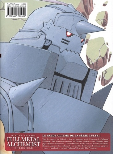 Le guide ultime de la série culte ! Tous les secrets de l'histoire, des personnages et de l'univers de Fullmetal Alchemist. Des interviews croisées de Hiromu Arakawa avec Hirohiko Araki (Jojo's Bizarre Adventure), Atsuchi Ohkubo (Soul Eater) ou Kazuki Nakashima (Gurren Lagann). De nombreux bonus inédits, illustrations hommages, gags en 4 cases et un chapitre exclusif Fullmetal Alchemist The Prototype.