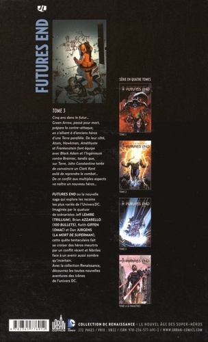 Trente-cinq ans dans le futur : le satellite l'? il devenu indépendant a mis sous sa coupe la quasi-totalité des super-héros, modifiés en cyborgs implacables. Les derniers justiciers encore libres mènent une résistance désormais futile et succombent les uns après les autres. Le dernier espoir réside dans le jeune Terry McGinnis, le successeur de Bruce Wayne en tant que Batman, téléporté dans le passé pour empêcher l'émergence de cette menace. Mais ce dernier arrive cinq ans trop tard... Contient : New52 Futures End #24-35