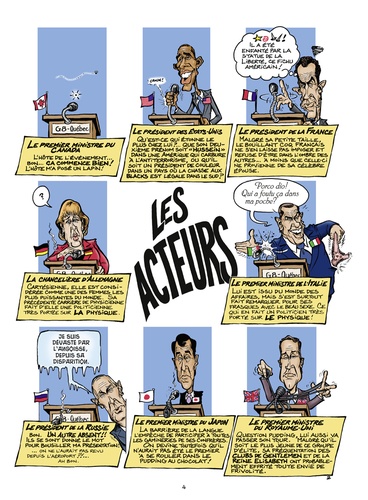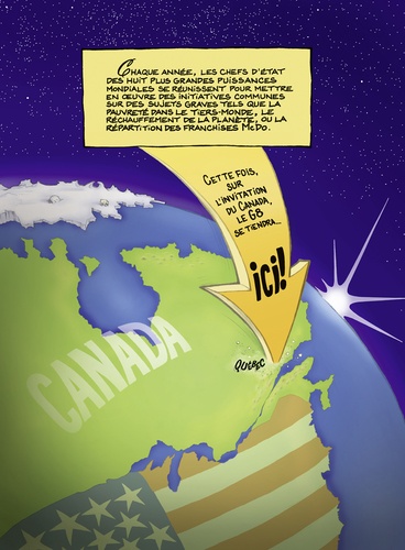 Ils sont huit, Une fois par an, ils se réunissent pour mettre en oeuvre des initiatives communes sur des sujets graves tels que l'économie mondiale, le réchauffement de la planète, la pauvreté ou les franchises Mc Do. Cette fois-ci, sur l'invitation du Canada, cette réunion se tiendra à Québec... Il va en falloir des pitreries de nos chefs d'état pour nous faire oublier la dernière crise...