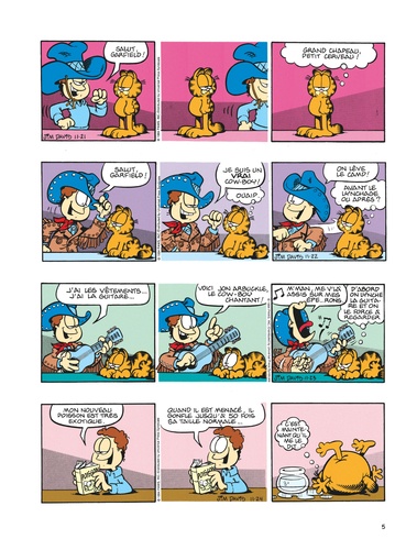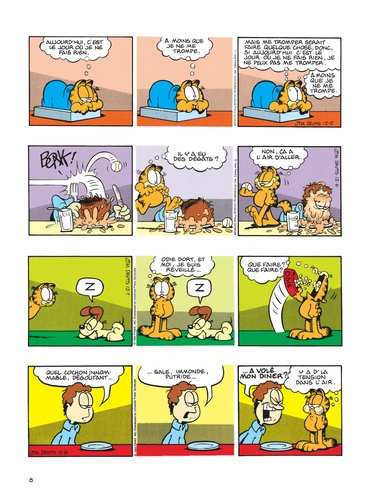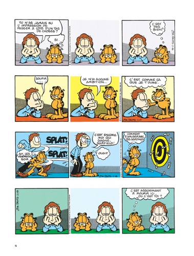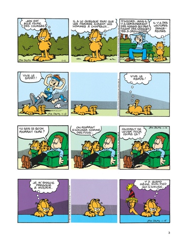 Le grand-père de Garfield, Otto le fou, était un pionnier. Il a fait parcourir des milliers de kilomètres à sa famille, à travers des contrées hostiles, en répétant : "J'entends un ouvre-boîte". Et si Garfield n'a rien du pionnier, il continue d'entendre les ouvre-boîtes. Avec lui, les souris n'ont rien a craindre : il ne course que le gruyère. En revanche, écrabouiller les araignées demandant peu d'effort, il nous fait un génocide. Quant aux oiseaux, à la seule idée qu'ils sont en train de s'empiffrer de gros vers juteux, il les laisse où ils sont. Côté flemme, Garfield dort dix-huit heures et neuf minutes d'affilée. Ca, c'est sur le ventre. Il pense pouvoir faire mieux sur le dos. L'idée de s'amuser comme un fou lui plaît bien, comme ça, de loin. Mais pour s'amuser, il faut au moins se lever. Alors il préfère se barber. Côté coeur, les tentatives de Jon sont toujours aussi piteuses. Quand il annonce à une fille qu'elle a gagné une soirée avec lui, elle répond qu'elle aurait préféré un lave-vaisselle. Garfield, toujours de bon conseil, lui suggère de contre-attaquer avec un grille-pain. Lui, pour Noël, il a eu un pull 100% poil de vache avec pis incorporé. C'est très seyant, sur un vieux gros chat de dix-sept ans...