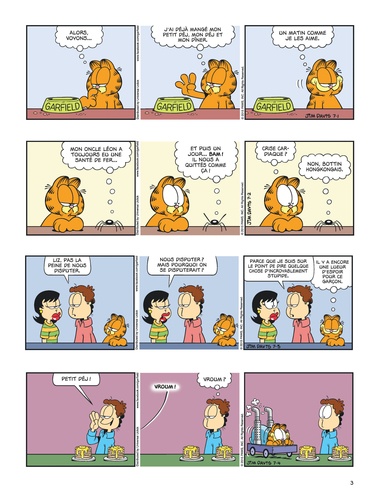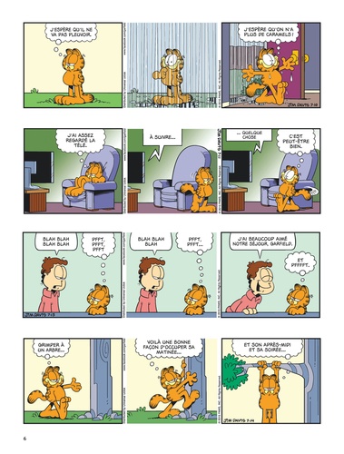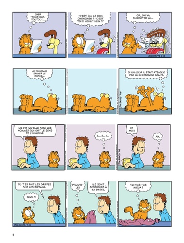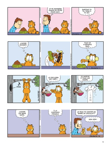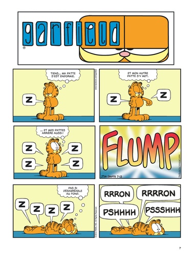 Voici venir les beaux jours... L'heure pour Garfield de sortir ses baskets et son jogging, d'aller à la salle soulever de la fonte, bref, de sacrifier aux dieux du stade et au culte du corps ! ? ... Euh, non, en fait. Garfield est un champion hors concours dans les catégories sieste et lasagne. C'est déjà énorme. Et c'est pour ça qu'on l'aime.