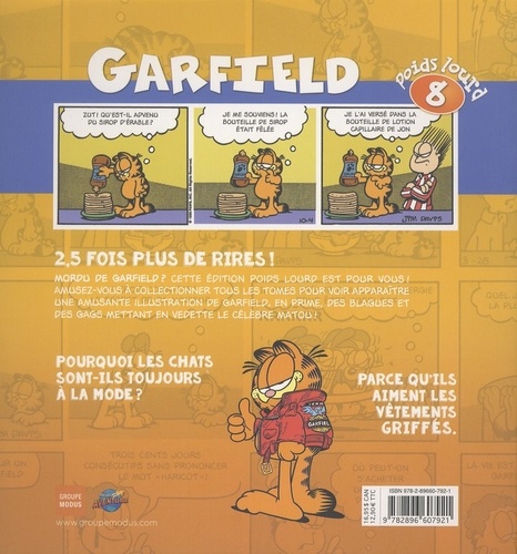 Blagues et rigolade en continu ! Retrouvez Garfield et ses compagnons dans de nouvelles aventures désopilantes. Voyez jusqu'à quel point les lundis peuvent s'avérer cauchemardesques pour le matou orange et découvrez les nouvelles affres amoureuses de son maître Jon. Collectionnez tous les tomes de la collection pour découvrir une amusante illustration formée par le dos des albums. Attention : rires garantis !
