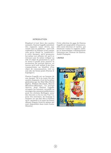 Qui de mieux placé que Gaston, cet inventeur invétéré, pour s'essayer à la publicité ? Heureusement, lorsqu'il s'agit de défendre le journal Spirou, Fantasio est là pour veiller au grain. Car le gaffeur le plus inventif de la rédaction ne lésine pas sur les moyens. Mais au-delà de la rédac', c'est une panoplie de produits que Gaston présente avec le soutien malicieux de Franquin et Jidéhem ! Pour la première fois rassemblées dans un unique ouvrage, vous retrouverez dans ce hors-série des planches célèbres et d'autres moins connues voire inédites. Un travail de recollection agrémenté comme il se doit de plusieurs commentaires pour mieux comprendre le travail de réclame fourni par les auteurs à l'époque !