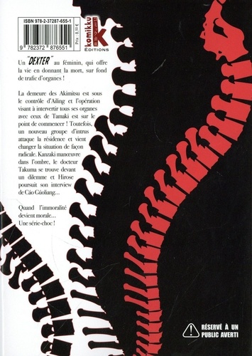 Un dexter au féminin, qui offre la vie en donnant la mort, sur fond de trafic d'organes ! La demeure des Akimitsu est sous le contrôle d'Ailing et l'opération visant à intervertir tous ses organes avec ceux de Tamaki est sur le point de commencer ! Toutefois, un nouveau groupe d'intrus attaque la résidence et vient changer la situation de façon radicale. Kanzaki manoeuvre dans l'ombre, le docteur Takuma se trouve devant un dilemme et Hirose poursuit son interview de Cáo Gúoliang... Quand l'immoralité devient morale... Une série-choc !