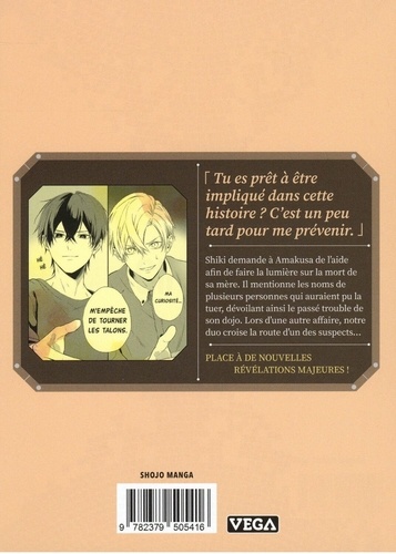 Tu es prêt à être impliqué dans cette histoire ? C'est un peu tard pour me prévenir. Shiki demande à Amakusa de l'aide afin de faire la lumière sur la mort de sa mère. Il mentionne les noms de plusieurs personnes qui auraient pu la tuer, dévoilant ainsi le passé trouble de son dojo. Lors d'une autre affaire, notre duo croise la route d'un des suspects... PLACE A DE NOUVELLES REVELATIONS MAJEURES !