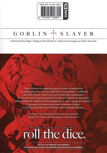 " Je ne sauve pas le monde. Je ne fais que tuer des gobelins. " Pour éliminer les gobelins qui se terrent en périphérie du village des elfes, le Crève-gobelins et son groupe s'infiltrent dans des ruines. Après avoir gravi une tour inquiétante, ils découvrent le shaman gobelin à la tête de la horde de monstres. Submergé par le nombre et désavantagé par le sort " nuage de torpeur ", le groupe se retrouve dans une situation critique. La prêtresse décide alors d'utiliser une technique taboue... Comme à l'accoutumée, retrouvez une nouvelle inédite de l'auteur Kumo Kagyu en fin de tome !