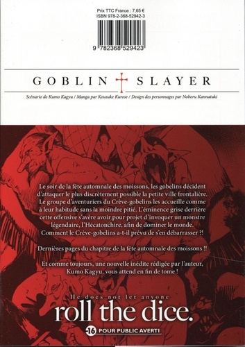 Le soir de la fête automnale des moissons, les gobelins décident d'attaquer le plus discrètement possible la petite ville frontalière. Le groupe d'aventuriers du Crève-gobelins les accueille comme à leur habitude sans la moindre pitié. L'éminence grise derrière cette offensive s'avère avoir pour projet d'invoquer un monstre légendaire, l'Hécatonchire, afin de dominer le monde. Comment le Crève-gobelins a-t-il prévu de s'en débarrasser ? ! Dernières pages du chapitre de la fête automnale des moissons !! Et comme toujours, une nouvelle inédite rédigée par l'auteur, Kumo Kagyu, vous attend en fin de tome !
