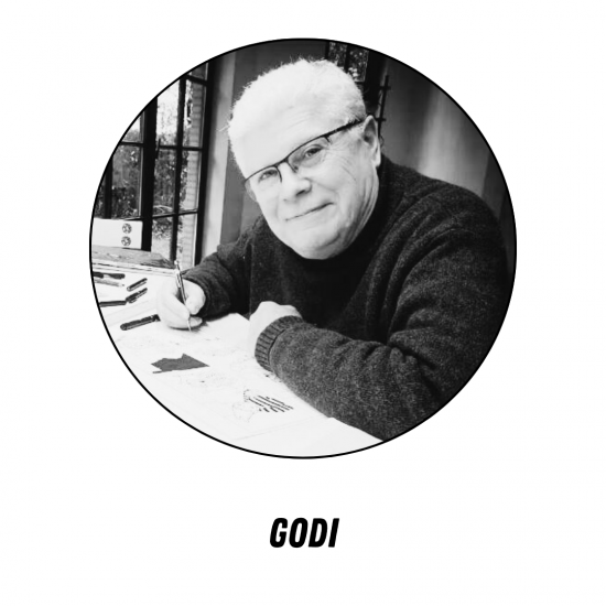 De eerste keer dat je Godi ziet, zal hij je onvermijdelijk aan iemand herinneren. Maar wacht… die onuitsprekelijke glimlach, die gestreepte trui en die zachtheid in zijn blik…? Maar natuurlijk, het is Leerling Dokus! Als Godi, net zoals Flaubert, soms samenvalt met zijn creatie, dan is dat omdat beiden die menselijkheid delen die zo schrijnend ontbreekt in de moderne school. Bovendien, iemand die als cartoonist begon kan toch niet fundamenteel slecht zijn, denk je niet? En als hij dan ook nog zijn eerste strips publiceerde in het tijdschrift "Tintin", bevestigt dat sterk onze eerste indruk! Godi volgt in de voetsporen van de grote meesters die de gloriedagen van "Spirou" hebben gevormd. Dankzij "Leerling Dokus", dat hij in 1992 met Zidrou creëerde, een stoorzender binnen een gevestigd systeem, kan hij de geest van de meester voortzetten. En het voordeel van het hebben van de grootste luilak in de stripwereld als held, is dat hij niet snel klaar zal zijn met school. We kunnen dus nog wel een tijdje genieten van het werk van Godi! En sinds 2014 ontdekken we een andere kant van hem met zijn overname van het personage van de beroemdste slaapmuis in de stripwereld, "Chlorophylle", die hij ook creëert met zijn kompaan Zidrou.