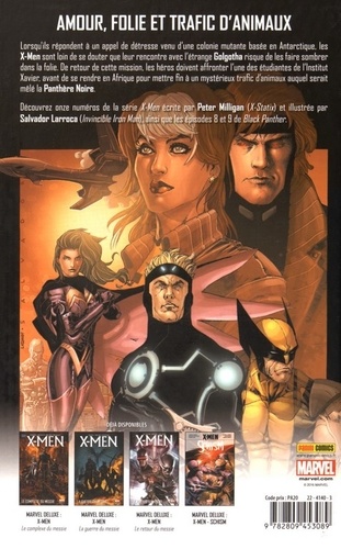 Lorsqu'ils répondent à un appel de détresse venu d'une colonie mutante basée en Antarctique, les X-Men sont loin de se douter que leur rencontre avec l'étrange Golgotha risque de les faire sombrer dans la folie. De retour de cette mission, les héros doivent affronter l'une des étudiantes de l'Institut Xavier, avant de se rendre en Afrique pour mettre fin à un mystérieux trafic d'animaux auquel serait mêlé la Panthère Noire. Découvrez onze numéros de la série X-Men écrite par Peter Milligan (X-Statix) et illustrée par Salvador Larroca (Invincible Iran Man), ainsi que les épisodes 8 et 9 de Black Panther.