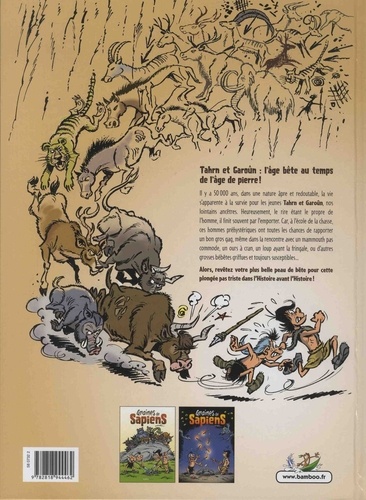 L'âge bête au temps de l'âge de pierre ! Il y a 40 000 ans, dans une nature âpre et redoutable, la vie s'apparente à la survie pour Tahrn et Garoûn, nos lointains ancêtres. Heureusement, le rire étant le propre de l'homme, il finit souvent par l'emporter. Car à l'école de la chasse, ces hommes préhystériques ont toutes les chances de vous apporter un bon gros gag bien juteux : même dans la rencontre avec un mammouth pas commode, un ours à cran, un loup ayant la fringale, ou d'autres grosses bébêtes griffues et toujours susceptibles... Alors, revêtez votre plus belle peau de bête pour cette plongée pas triste dans l'Histoire avant l'Histoire !