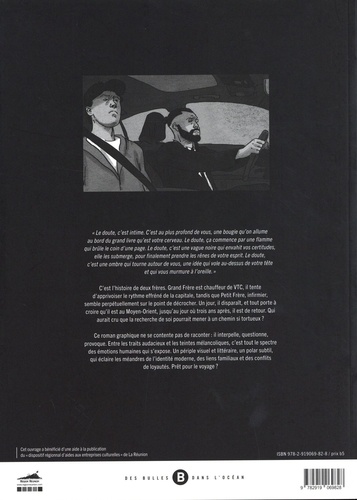 Grand frère est chauffeur de VTC. Enfermé onze heures par jour dans sa "carlingue" , branché en permanence sur la radio, il rumine sur sa vie et le monde qui s'offre à lui de l'autre côté du pare-brise. Petit frère est parti par idéalisme en Syrie depuis de nombreux mois. Engagé comme infirmier par une organisation humanitaire musulmane, il ne donne plus aucune nouvelle. Ce silence ronge son père et son frère, suspendus à la question restée sans réponse : pourquoi est-il parti ? Un soir, l'interphone sonne. Petit frère est de retour. Un album à l'humour imagé qui aborde la grave question du terrorisme et explore un monde de travailleurs uberisés, de chauffeurs écrasés de solitude, luttant pour survivre, mais décrit aussi l'univers de ceux qui sont partis faire le djihad en Syrie : l'embrigadement, les combats, leur retour impossible en France... Emerge ainsi l'histoire poignante d'une famille franco-syrienne, dont le père et les deux fil