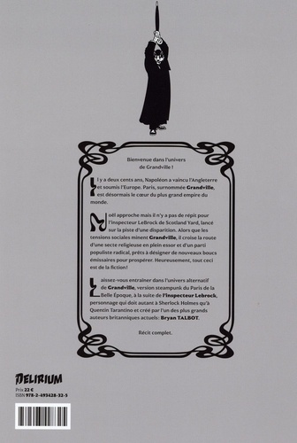 Il y a deux cents ans, Napoléon a vaincu l'Angleterre et soumis l'Europe. Paris, surnommée Grandville, est désormais le coeur du plus grand empire du monde. Noël approche mais il n'y a pas de répit pour l'inspecteur LeBrock de Scotland Yard, lancé sur la piste d'une disparition. Alors que les tensions sociales minent Grandville, il croise la route d'une secte religieuse en plein essor et d'un parti populiste radical, prêts à désigner de nouveaux boucs émissaires pour prospérer. Heureusement, tout ceci est de la fiction ! Laissez-vous entraîner dans l'univers alternatif de Grandville, version steampunk du Paris de la Belle Epoque, à la suite de l'inspecteur Lebrock, personnage qui doit autant Sherlock Holmes qu'a Quentin Tarantino et créé par l'un des plus grands auteurs britanniques actuels : Bryan Talbot.