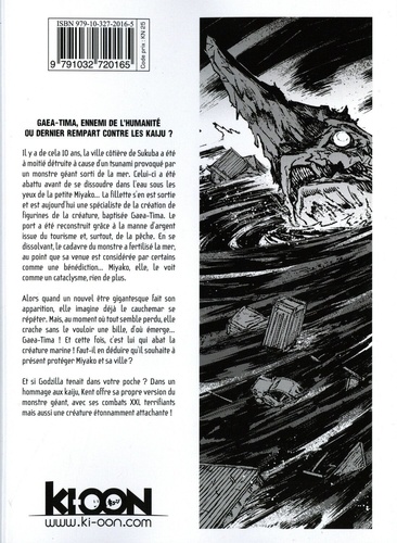 Gaea-Tima, ennemi de l'humanité ou dernier rempart contre les kaiju ? Il y a de cela 10 ans, la ville côtière de Sukuba a été à moitié détruite à cause d'un tsunami provoqué par un monstre géant sorti de la mer. Celui-ci a été abattu avant de se dissoudre dans l'eau sous les yeux de la petite Miyako... La fillette s'en est sortie et est aujourd'hui une spécialiste de la création de figurines de la créature, baptisée Gaea-Tima. Le port a été reconstruit grâce à la manne d'argent issue du tourisme et, surtout, de la pêche. En se dissolvant, le cadavre du monstre a fertilisé la mer, au point que sa venue est considérée par certains comme une bénédiction... Miyako, elle, le voit comme un cataclysme, rien de plus. Alors quand un nouvel être gigantesque fait son apparition, elle imagine déjà le cauchemar se répéter. Mais, au moment où tout semble perdu, elle crache sans le vouloir une bille, d'où émerge... Gaea-Tima ! Et cette fois, c'est lui qui abat la créature marine ! Faut-il en déduire qu'il souhaite à présent protéger Miyako et sa ville ? Et si Godzilla tenait dans votre poche ? Dans un hommage aux kaiju, Kent offre sa propre version du monstre géant, avec ses combats XXL terrifiants mais aussi une créature étonnamment attachante !