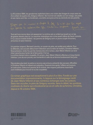 Le 16 octobre 1984, les gendarmes repêchent dans une rivière des Vosges le corps sans vie d'un enfant de quatre ans, Grégory Villemin. Son bonnet est rabattu sur son visage, ses pieds et ses mains sont liés. Le lendemain, une lettre anonyme arrive au domicile de ses parents. Tout est hors norme dans cet assassinat. La victime est un enfant qui jouait sur un tas de gravier devant chez lui. Le meurtrier revendique son crime avant même de l'avoir commis. Il n'y a aucun mobile évident : les parents de Grégory sont un jeune couple d'ouvriers, amoureux et sans histoires. Un premier suspect, Bernard Laroche, un cousin du père, est arrêté puis relâché. Pour le défendre, ses avocats détournent l'attention vers la mère de l'enfant, Christine Villemin. Sous pression, rendu fou par les manoeuvres et la rumeur, Jean-Marie Villemin se rend chez Laroche pour tenter de le faire parler. Il le tue. La victime devient alors coupable. En prison, Jean-Marie Villemin effectue un long chemin intérieur. Lors de son procès, son humanité et celle de sa femme bouleversent les jurés. Des années plus tard, la justice a reconnu ses erreurs, présenté des excuses officielles à Christine Villemin et réparé son préjudice. Quarante ans après, l'affaire est toujours en instruction. Grâce aux parents de la victime, des moyens judiciaires importants sont mobilisés pour trouver le ou les coupables. Ce roman graphique est exceptionnel à plus d'un titre. Fondé sur une documentation impressionnante, il s'appuie sur le témoignage inédit de Jean-Marie Villemin et ses nombreux échanges avec les auteurs. Sans rien occulter, le père de Grégory raconte, dans le détail, les sombres coulisses du drame qui a bouleversé sa vie et celle de sa femme, Christine, depuis le 16 octobre 1984.