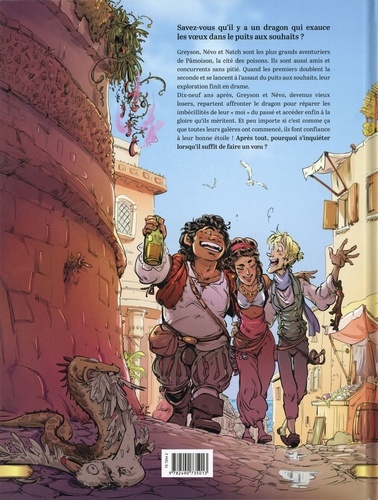 Savez-vous qu'il y a un dragon qui exauce les voeux dans le puits aux souhaits ? Greyson, Névo et Natch sont les plus grands aventuriers de Pâmoison, la cité des poisons. Ils sont aussi amis et concurrents sans pitié. Quand les premiers doublent la seconde et se lancent à l'assaut du puits aux souhaits, leur exploration finit en drame. Dix-neuf ans après, Greyson et Névo, devenus losers, repartent affronter le dragon pour réparer les imbécillités de leur "moi" du passé et accéder enfin à la gloire qu'ils méritent. Et peu importe si c'est comme ça que toutes leurs galères ont commencé, ils font confiance à leur bonne étoile ! Après tout, pourquoi s'inquiéter lorsqu'il suffit de faire un voeu ?