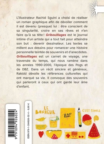 L'illustrateur Rachid Sguini a choisi de réaliser un roman graphique afin de dévoiler comment il est devenu (presque) lui : être conscient de sa singularité, croire en ses rêves et n'en faire qu'à sa tête ! Gribouillages est le journal intime d'un artiste qui a tout fait pour atteindre son but : devenir dessinateur. Les textes se mêlent aux dessins pour romancer une histoire personnelle teintée de souvenirs et d'anecdotes. Gribouillages est un carnet de voyage, une traversée du temps, qui nous ramène dans les années 1990-2000, l'époque des Pogs et de DBZ. Dans un récit sincère et généreux, Rakidd dévoile les références culturelles qui ont marqué sa vie. Il convoque des souvenirs qui parleront à ceux qui ont gardé leur âme d'enfant.
