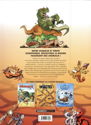 Entre humour et vérité scientifique, découvrez le monde fascinant des animaux ! Certains ont disparu depuis des centaines de millions d'années, d'autres vivent à des centaines de mètres sous la surface des océans ou pullulent sans que vous n'y prêtiez attention. A plumes, à écailles, à poils ou à carapace, ces animaux ont beaucoup à nous apprendre. Alors, n'attendez pas, plongez dans la vie trépidante des dinosaures, des animaux marins et des insectes avec ces albums bourrés d'infos vraies de vrai et remplis de rugissements en tout genre, de feulements à n'en plus finir, de caquètements et de bruissements par milliers... et bien sûr d'éclats de rire !