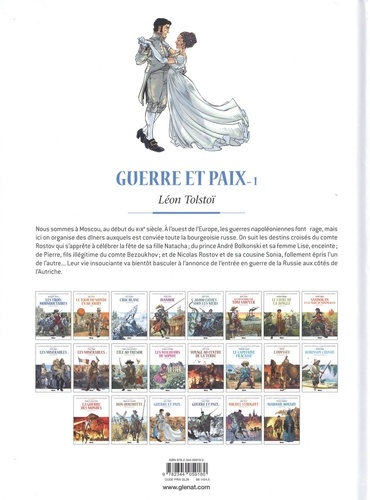 Le chef-d'oeuvre de Léon Tolstoï en bande dessinée ! Nous sommes à Moscou, au début du XIXe siècle. A l'ouest de l'Europe, les guerres napoléoniennes font rage, mais ici on organise des dîners auxquels est conviée toute la bourgeoisie russe. On suit les destins croisés du comte Rostov qui s'apprête à célébrer la fête de sa fille Natacha ; du prince André Bolkonski et sa femme Lise, enceinte ; de Pierre, fils illégitime du comte Bezoukhov ; et de Nicolas Rostov et de sa cousine Sonia, follement épris l'un de l'autre... Leur vie insouciante va bientôt basculer à l'annonce de l'entrée en guerre de la Russie aux côtés de l'Autriche !