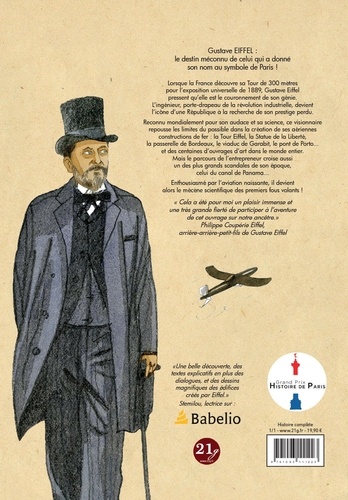 Le destin méconnu de celui qui a donné son nom au symbole de Paris ! Lorsque la France découvre sa Tour de 300 mètres pour l'exposition universelle de 1889, Gustave Eiffel pressent qu'elle est le couronnement de son génie. L'ingénieur, porte-drapeau de la révolution industrielle, devient l'icône d'une République à la recherche de son prestige perdu. Reconnu mondialement pour son audace et sa science, ce visionnaire repousse les limites du possible dans la création de ses aériennes constructions de fer : la Tour Eiffel, la Statue de la Liberté, la passerelle de Bordeaux, le viaduc de Garabit, le pont de Porto... et des centaines d'ouvrages d'art dans le monde entier. Mais le parcours de l'entrepreneur croise aussi un des plus grands scandales de son époque, celui du canal de Panama... "Cela a été pour moi un plaisir immense et une très grande fierté de participer à l'aventure de cet ouvrage sur notre ancêtre". Philippe Coupérie Eiffel, arrière-arrière-petit-fils de Gustave Eiffel.