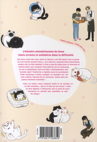 L'histoire attendrissante de deux chats errants et solidaires dans la difficulté. Nos deux chats des rues, Hachi et Maruru, ont été placés sous la garde du très louche humain Yasuo... Et si Maruru, anciennement domestiqué, semble vite s'y être habitué, il n'en va pas de même pour le farouche et rebelle Hachi, qui a toujours vécu dans la rue et a beaucoup de mal à sympathiser avec son hôte ! Heureusement, leur "grande soeur Ecaille" les a rejoints aussi et sa présence l'aide beaucoup à mieux accepter sa nouvelle vie. Les trois chamis, heureux de se retrouver, vivent alors de joyeux moments ensemble ! Mais, un matin, Yasuo emporte Hachi et un terrible cri se fait entendre... Qu'a-t-il bien pu lui arriver ? Vont-ils être séparés ? ! Découvrez vite la suite de leurs aventures en suivant leur quotidien au sein du refuge !