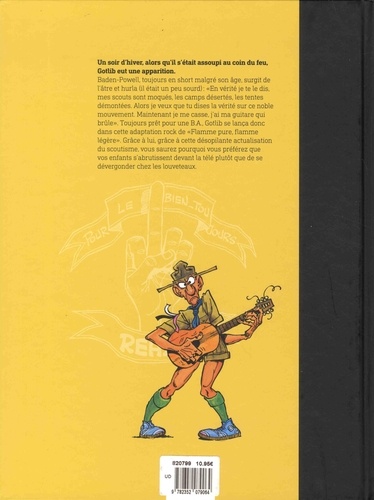 Un soir d'hiver, alors qu'il s'était assoupi au coin du feu, Gotlib eut une apparition. Baden-Powell, toujours en short malgré son âge, surgit de l'âtre et hurla (il était un peu sourd): "En vérité je te le dis, mes scouts sont moqués, les camps désertés, les tentes démontées. Alors je veux que tu dises la vérité sur ce noble mouvement. Maintenant je me casse, j'ai ma guitare qui brûle". Toujours prêt pour une B.A., Gotlib se lança donc dans cette adaptation rock de "Flamme pure, flamme légère". Grâce à lui, grâce à cette désopilante actualisation du scoutisme, vous saurez pourquoi vous préférez que vos enfants s'abrutissent devant la télé plutôt que de se dévergonder chez les louveteaux.
