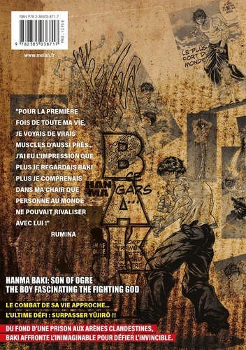 Baki Hanma entame un entraînement radical dans l'ombre de son propre esprit. Grâce au Shadow Fighting, il affronte mentalement des adversaires comme une mante religieuse géante de 100 kg. Ce voyage intérieur, entre hallucination et discipline martiale, révèle ses intentions les plus profondes. Affronter son père, Yujiro, l'homme le plus fort du monde, et le surpasser. Une saga culte. Une troisième saison explosive ! Troisième arc narratif du phénomène martial signé Keisuke Itagaki, Hanma Baki (Son of Ogre) marque un tournant dans la légende. Cette saison centrale voit Baki s'attaquer à son objectif ultime : affronter et surpasser son père, le terrifiant Yujiro Hanma, surnommé l'Ogre - l'homme le plus fort du monde. Mais avant ce duel mythique, Baki se prépare à sa façon, en menant un entraînement aussi radical que déroutant. Du fin fond de son esprit, il se confronte à des adversaires mentaux nés de sa propre imagination, comme une mante religieuse géante. Cette introspection martiale laisse bientôt place à une nouvelle épreuve ? : l'univers carcéral américain, où il provoque volontairement son incarcération afin d'affronter Biscuit Oliva, incarnation vivante de la force brute. Et quand surgit Pickle, un homme préhistorique décongelé intact, la confrontation entre l'ère moderne et la violence primale prend une tournure spectaculaire. Ce duel improbable propulse la série dans une dimension plus sauvage encore. Jusqu'au point culminant ? : l'affrontement tant attendu entre Baki et son père, où l'héritage du combat prend toute sa mesure. Dans cette saison de la maturité, Baki ne cherche plus à prouver sa valeur - il l'impose. Hanma Baki concentre certains des duels les plus emblématiques de la saga, portés par une mise en scène toujours plus audacieuse et graphique. Cette série a aussi grandement contribué à faire rayonner la licence à l'international. Un succès durable, nourri par une fanbase passionnée qui ne cesse de croître. Une édition française à la hauteur du mythe. La série revient chez Meian dans une édition fidèle à l'ambition de son auteur : 21 volumes en Perfect Edition, exploitant la réédition japonaise la plus récente... tout en allant bien au-delà. Là où l'édition japonaise restait sobre, la version française propose un grand format A5, un papier premium, et des finitions soignées sur chaque jaquette (vernis sélectif, relief, Pantone métallique). Mais la véritable force de cette édition réside dans l'ajout de pages couleur inédites. Chaque volume intègre les illustrations en couleurs issues de la prépublication japonaise, ainsi que celles des couvertures originales de la première édition japonaise, jamais réutilisées depuis. En offrant cette richesse graphique et cette exigence de fabrication, Meian propose une édition de référence, pensée pour tous ceux qui suivent la saga depuis ses débuts, comme pour ceux qui souhaitent la découvrir dans sa forme la plus aboutie.