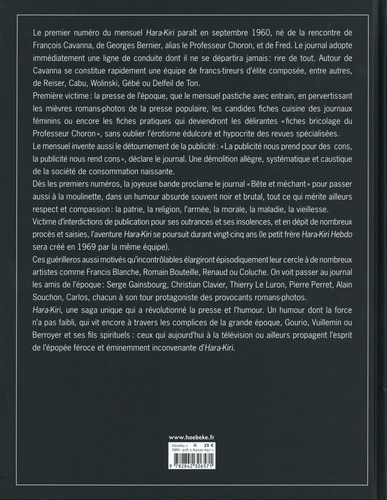 Le premier numéro du mensuel Hara-Kiri paraît en septembre 1960, né de la rencontre de François Cavanna, de Georges Bernier, alias le Professeur Choron, et de Fred. Le journal adopte immédiatement une ligne de conduite dont il ne se départira jamais : rire de tout. Autour de Cavanna se constitue rapidement une équipe de francs-tireurs d'élite composée, entre autres, de Reiser, Cabu, Wolinski, Gébé ou Delfeil de Ton. Première victime : la presse de l'époque, que le mensuel pastiche avec entrain, en pervertissant les mièvres romans-photos de la presse populaire, les candides fiches cuisine des journaux féminins ou encore les fiches pratiques qui deviendront les délirantes "fiches bricolage du Professeur Choron", sans oublier l'érotisme édulcoré et hypocrite des revues spécialisées. Le mensuel invente aussi le détournement de la publicité: "La publicité nous prend pour des cons, la publicité nous rend cons", déclare le journal. Une démolition allègre, systématique et caustique de la société de consommation naissante. Dès les premiers numéros, la joyeuse bande proclame le journal "Bête et méchant" pour passer aussi à la moulinette, dans un humour absurde souvent noir et brutal, tout ce qui mérite ailleurs respect et compassion : la patrie, la religion, l'armée, la morale, la maladie, la vieillesse. Victime d'interdictions de publication pour ses outrances et ses insolences, et en dépit de nombreux procès et saisies, l'aventure Hara-Kiri se poursuit durant vingt-cinq ans (le petit frère Hara-Kiri Hebdo sera créé en 1969 par la même équipe). Ces guérilleros aussi motivés qu'incontrôlables élargiront épisodiquement leur cercle à de nombreux artistes comme Francis Blanche, Romain Bouteille, Renaud ou Coluche. On voit passer au journal les amis de l'époque : Serge Gainsbourg, Christian Clavier, Thierry Le Luron, Pierre Perret, Alain Souchon, Carlos, chacun à son tour protagoniste des provocants romans-photos. Hara-Kiri, une saga unique qui a révolutionné la presse et l'humour. Un humour dont la force n'a pas faibli, qui vit encore à travers les complices de la grande époque, Gourio, Vuillemin ou Berroyer et ses fils spirituels : ceux qui aujourd'hui à la télévision ou ailleurs propagent l'esprit de l'épopée féroce et éminemment inconvenante d'Hara-Kiri.