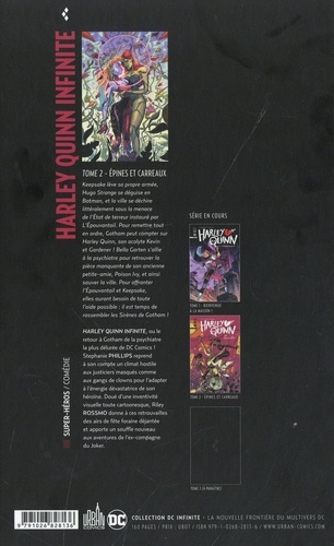 Tome 1, Epines et carreaux. Keepsake lève sa propre armée, Hugo Strange se déguise en Batman el la ville se déchire litéralement sous la menace de l'Etat de terreur instauré par L'Epouvantail. Pour remettre tout en ordre, Gotham peut compter sur Harley Quinn, son acolyte Kevin et Gardener ! Bella Garten s'allie à la psychiatre pour retrouver la pièce manquante de son ancienne petite-amie, Poison Ivy, et ainsi sauver la ville. Pour affronter l'Epouvantail et Keepsake, elles auront besoin de toute l'aide possible il est temps de rassembler les Sirènes de Gotham ! Harley quinn infinite, ou le retour à Gotham de la psychiatre la plus délurée de DC Comics ! Stephanie Phillips reprend à son compte un climat hostile aux justiciers masqués comme aux gangs de clowns pour l'adapter à l'énergie dévastatrire de son héroïne. Dosé d'une inventivité visuelle toute cartoocnesque, Riley Rossmo donne à ces retrouvailles des airs de fête foraine déjantée et apporte un souffle nouveau aux aventures de l'ex-compagne du Joker.
