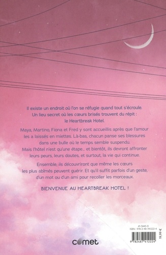Il existe un endroit où l'on se réfugie quand tout s'écroule. Un lieu secret où les coeurs brisés trouvent du répit : le Heartbreak Hotel. Maya, Martino, Fiona et Fred y sont accueillis après que l'amour les a laissés en miettes. Là-bas, chacun panse ses blessures dans une bulle où le temps semble suspendu. Mais l'hôtel n'est qu'une étape... et bientôt, ils devront affronter leurs peurs, leurs doutes, et surtout, la vie qui continue. Ensemble-ils découvriront que même les coeurs les plus abîmés peuvent guérir. Et qu'il suffit parfois d'un geste, d'un mot ou d'un ami pour recoller les morceaux. Bienvenue au Heartbreak Hotel !