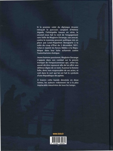 Si le premier volet du diptyque Arsenic retraçait le parcours sanglant d'Hélène Jégado, l'infatigable tueuse en série, le second nous fait le récit de l'engagement sans faille de Magloire Dorange, son avocat, contre le nouveau pouvoir politique mis en place par Louis-Napoléon Bonaparte à la suite du coup d'Etat du 2 décembre 1851. Celui-ci rejoint les forces fidèles à la République dans leur lutte acharnée contre l'autoritarisme étatique. Jeune homme passionné, Magloire Dorange s'appuie dans son combat sur le procès tronqué de l'empoisonneuse qui, selon lui, aurait dû être repoussé afin de lui offrir une défense digne de ce nom. Il pense la femme folle, donc non responsable de ses actes, et voit dans le sort qui lui est fait le symbole d'une République décapitée. A travers cette bande dessinée en deux tomes, les auteurs redonnent vie à la plus implacable meurtrière de tous les temps.