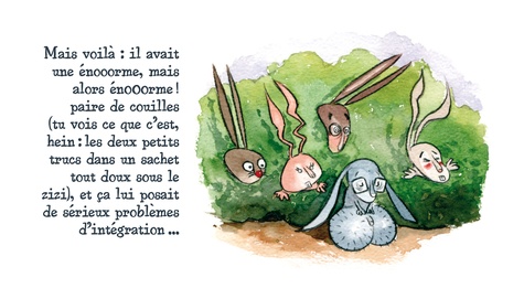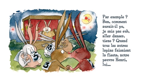 Henri, le lapin, hilarante fable sur un petit lapin à lunettes - qui se fait moquer par tous les animaux de la forêt du fait de sa paire de testicules totalement disproportionnée - et deviendra un héros dans sa petite communauté animalière en sauvant Heliette, petite lapine handicapée suite à un accident. Henri, le lapin à grosses couilles est un faux vrai livre pour enfants (et non l'inverse). Hilarante fable sur un petit lapin à lunettes - qui se fait moquer par tous les animaux de la forêt du fait de sa paire de testicules totalement disproportionnée - et deviendra un héros dans sa petite communauté animalière en sauvant Heliette, petite lapine handicapée suite à un accident. On pourra y voir, comme souvent dans les fables, une parabole dont le thème est, on s'en serait douté, un plaidoyer pour le respect des différences.