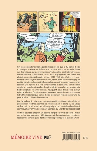 Cet essai entend montrer, à partir de cas précis, que la BD franco-belge "classique" reflète et diffuse une certaine vision du monde, basée sur des valeurs qui peuvent aujourd'hui paraître contradictoires : anticommunisme, colonialisme, mais aussi engagement en faveur des plus démunis. La création des années 1930-1950, faite d'allers et retours entre les deux pays et les deux cultures, est en effet, pour une large part, portée par des milieux catholiques plus ou moins conservateurs, mais sociaux. Des figures à la fois conquérantes et solidaires, comme celle du pieux chevalier défendant les plus faibles, ou celle du missionnaire barbu soignant les autochtones, naviguent ainsi d'une série et d'un épisode à l'autre. Certains auteurs amorcent toutefois une rupture avec la tradition idéologique franco-belge bien avant l'émergence d'une BD pour adultes cultivant l'irrévérence. On s'attachera à relire sous cet angle politico-religieux des récits régulièrement réédités, comme les Tintin en n