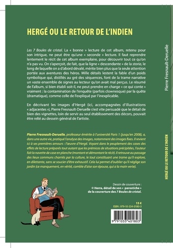 Les 7 Boules de cristal. La "bonne" lecture de cet album, retenu pour son intrigue, ne peut être qu'une "seconde" lecture. Il faut reprendre lentement le récit de cet album exemplaire, pour découvrir tout ce qu'on n'a pas vu. On s'aperçoit, de fait, que la ligne "descendante" de la storia, le long de laquelle on a d'abord dévalé, mérite bien plus que la seule attention portée aux aventures des héros. Mille détails lestent la fable d'un poids symbolique qui, distillés au gré des séquences, font de la trame narrative un vaste ensemble de signes au lecteur qu'on avait mal perçus. Le résumé de l'album, si bien établi soit-il, ne peut prendre en charge "ce qui conte" vraiment : la contamination de l'enquête (parfois clownesque) par la quête (dramatique), comme celle de l'expliqué par l'inexplicable. En décrivant les images d'Hergé (ici, accompagnées d'illustrations "adjacentes"), Pierre Fresnault-Deruelle s'est vite persuadé que le détail de bien des vignettes, loin de servir au seul établissement des décors, pouvait être relié au dessein général de l'artiste.
