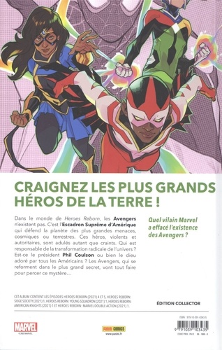 Dans ce monde où les Avengers n'existent pas (ils ont été remplacés par l'Escadron Suprême d'Amérique), les vilains eux sont toujours là, mais ils ne ressemblent pas tout à fait à ceux que nous connaissons. Docteur Spectrum affronte Rocket Raccoon ! Nighthawk combat le Bouffon ! Power Princess visite les ruines d'Asgard ! Et qu'arrive-t-il au nouveau Starbrand ? Située dans la droite ligne de la série Avengers publiée dans AVENGERS UNIVERSE, l'événement Heroes Reborn s'amuse des parallèles entre les plus grands héros Marvel et leurs homologues de la Distinguée Concurrence : la Ligue de Justice d'Amérique, dont l'Escadron Suprême s'inspire de façon évidente. Une aventure palpitante qui fait tomber les barrières entre les différents univers comics.