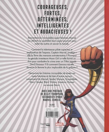 Courageuses, fortes, déterminées, intelligentes et audacieuses ! Rencontrez les incroyables super-héroines Marvel qui utilisent leurs super-pouvoirs pour aider les autres et sauver le monde. Comment la talentueuse pilote superstar et exploratrice de l'espace Captain Marvel, protège-t-elle la Terre des menaces extraterrestres ? Pourquoi la géniale inventeure Moon Girl a-t-elle formé un duo pour combattre le crime avec T-Rex appelé Devil Dinosaur ? Et comment Gamora est-elle devenue la femme la plus implaccable de la galaxie ? Découvrez les histoires incroyables de toutes ces super-héroines et de bien d'autres encore, notamment Ms Marvel, Spider-Woman, Ecureuillette, Shuri, Quake, Black Widow, America Chavez ou encore Storm.