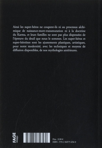 Ainsi les super-héros ne coupent-ils ni au processus alchimique de naissance-mort-transmutation ni à la doctrine du Karma, et leurs familles ne sont pas plus dispensées de l'épreuve du deuil que nous le sommes. Les super-héros et super-héroïnes sont les ajustements plastiques, artistiques, pour notre modernité, avec les techniques et moyens de diffusion disponibles, de nos mythologies antérieures.