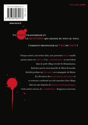 Un tabou transgressé et un quotidien qui change du tout au tout. Comment distinguer le vrai du faux ? Chaque année, à la même date, une personne meurt tandis qu'une autre est enlevée. Ces " coïncidences " se succèdent dans le petit village reculé de Hinamizawa. Entraîné par la soeur jumelle de Mion Sonozaki, Keiichi profane un lieu sacré en compagnie de Shion. Il y découvre des instruments de torture et se retrouve confronté au côté macabre d'un village bâti sur une légende de démons anthropophages. Cette année encore, la " malédiction " frappera à nouveau. Qui a fait quoi ? Parviendront-ils à mettre la main sur un miracle parmi la multitude de possibilités ?