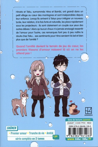 Hinata et Taku, surnommés Hina et Bambi, ont grandi dans un petit village au coeur des montagnes et sont inséparables depuis leur enfance. Lorsqu'ils arrivent à Tokyo pour intégrer un nouveau lycée, leur relation, à la fois forte et naturelle, les place rapidement sous les projecteurs : ils sont clairement un couple aux yeux des autres élèves ! Alors qu'aucun d'eux n'a jamais envisagé ressentir de l'amour pour l'autre, ces remarques font peu à peu naître le doute chez Taku... ses sentiments pour Hina seraient-ils bel et bien plus que de l'amitié ? Quand l'amitié devient le terrain de jeu du coeur, les premiers frissons d'amour naissent là où on ne les attend pas !